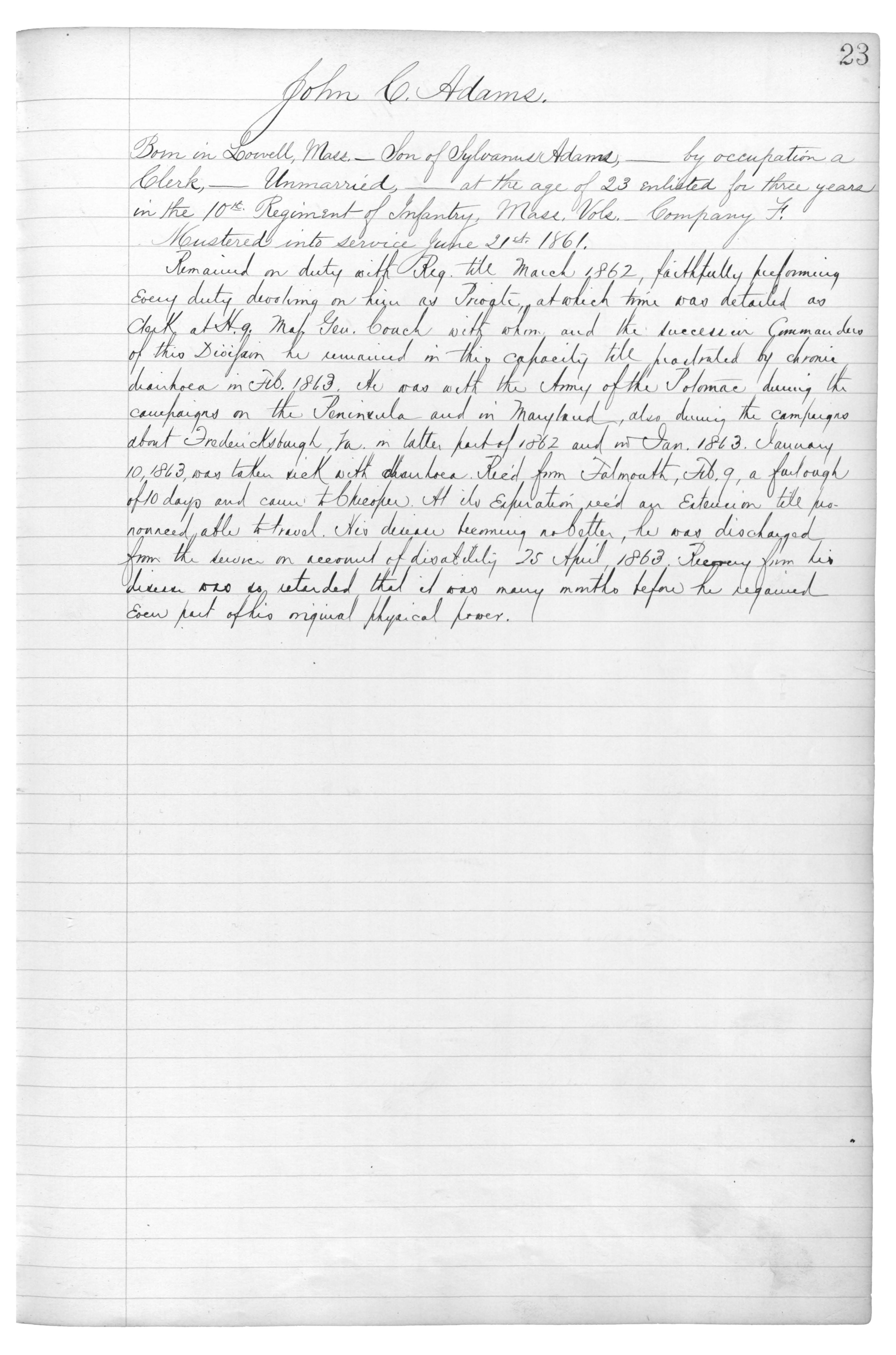 Born in Lowell, Mass.___Son of Sylvanus Adams,___by occupation a Clerk,___Unmarried,___at the age of 23 enlisted for three years in the 10th. Regiment of Infantry, Mass. Vols.___Company F. Mustered into service June 21st. 1861.