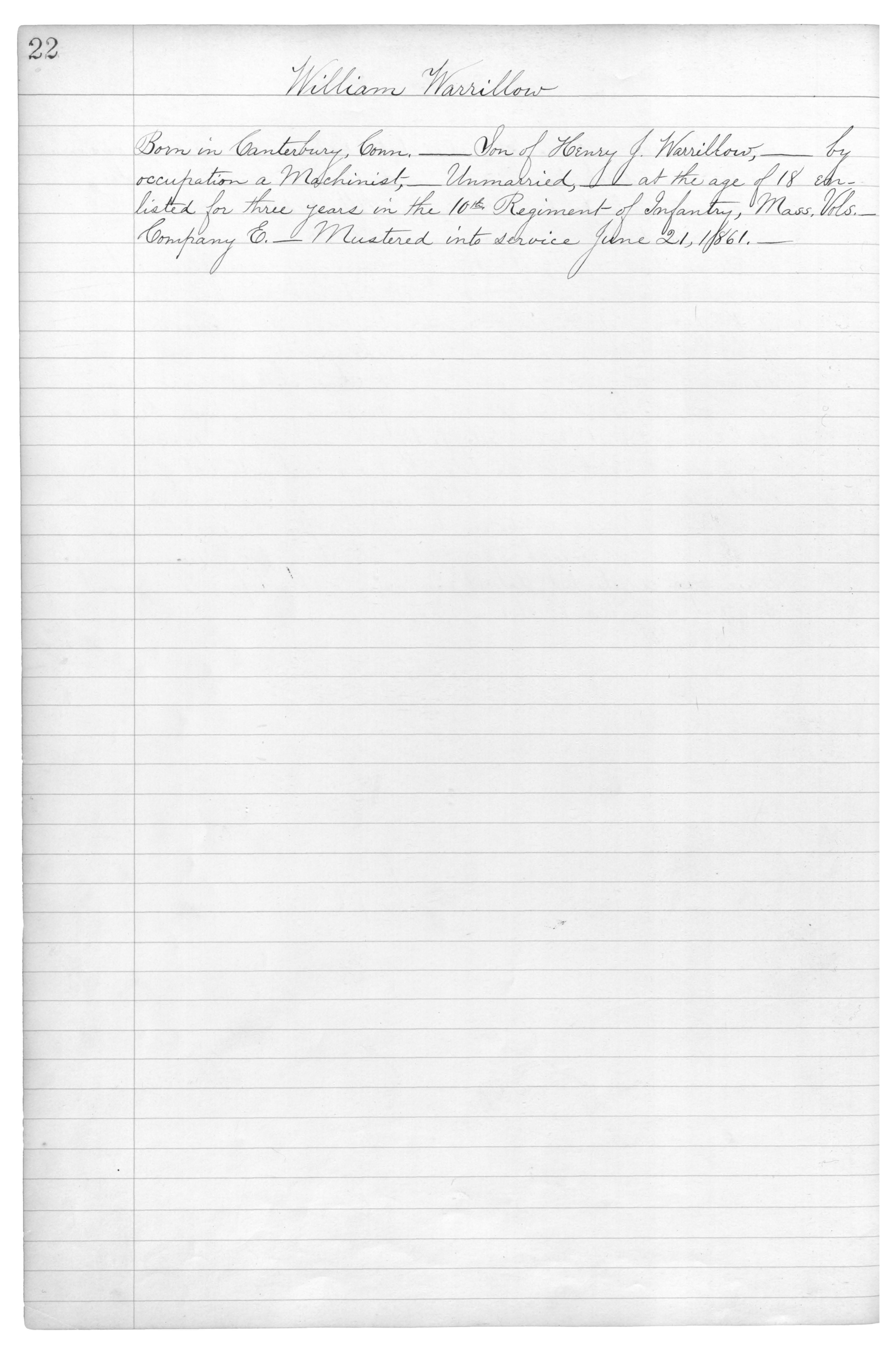Born in Canterbury, Conn.___Son of Henry J. Warrillow,___by occupation a Machinist,___Unmarried,___at the age of 18 enlisted for three years in the 10th. Regiment of Infantry, Mass. Vols.___Company E.___Mustered into service June 21, 1861.___