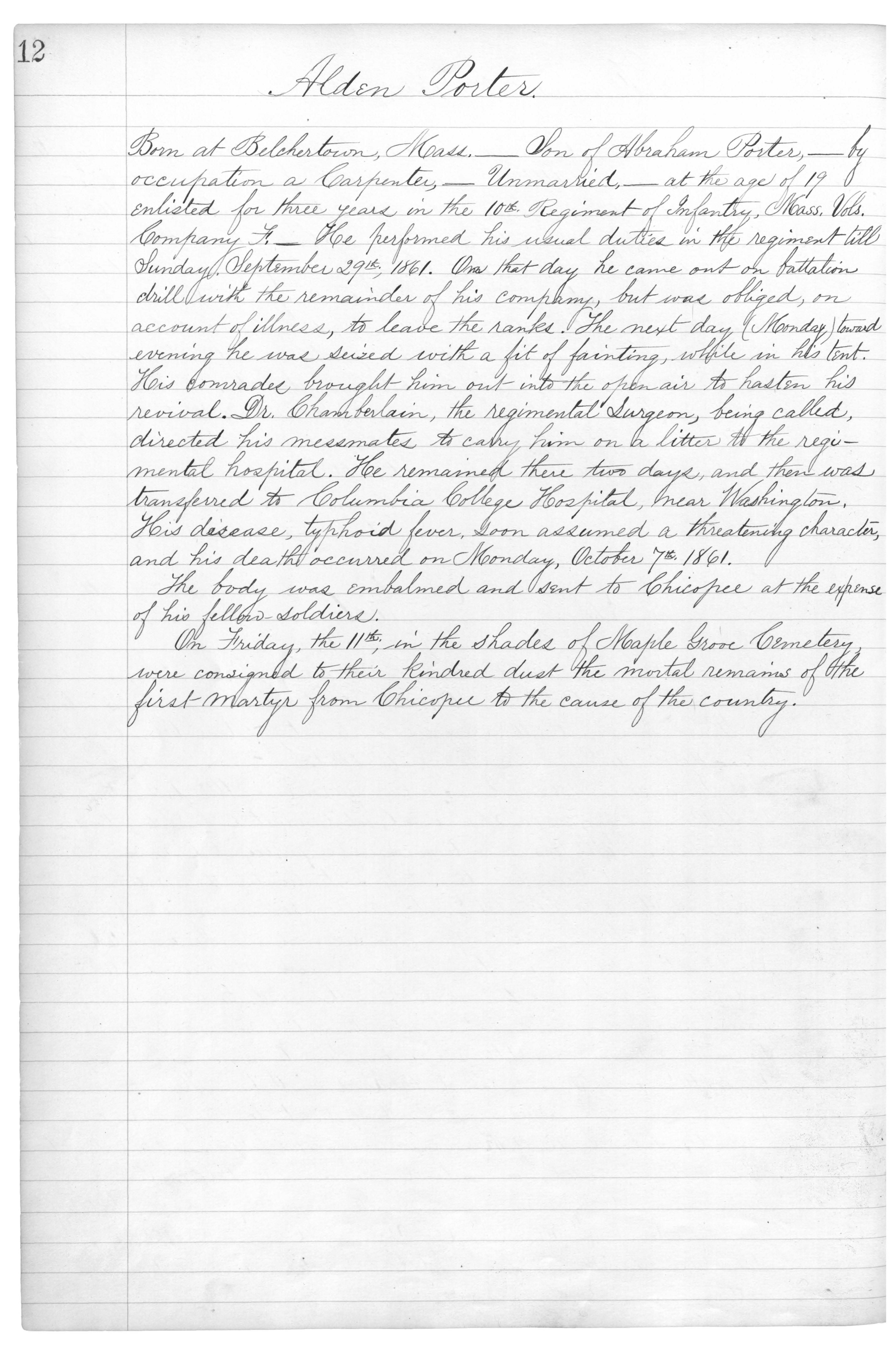 Born at Belchertown, Mass.___Son of Abraham Porter,___by occupation a Carpenter,___Unmarried,___at the age of 19 enlisted for three years in the 10th. Regiment of Infantry, Mass. Vols. Company F.___He performed his usual duties in the regiment till Sunday, September 29th., 1861. On that day he came out on battalion drill with the remainder of his company, but was obliged, on account of illness, to leave the ranks. The next day (Monday) toward evening he was seized with a fit of fainting, while in his tent. His comrades brought him out into the open air to hasten his revival. Dr. Chamberlain, the regimental Surgeon, being called, directed his messmates to carry him on a litter to the regimental hospital. He remained there two days, and then was transferred to Columbia College Hospital, near Washington. His disease, typhoid fever, soon assumed a threatening character, and his death occurred on Monday, October 7th. 1861.