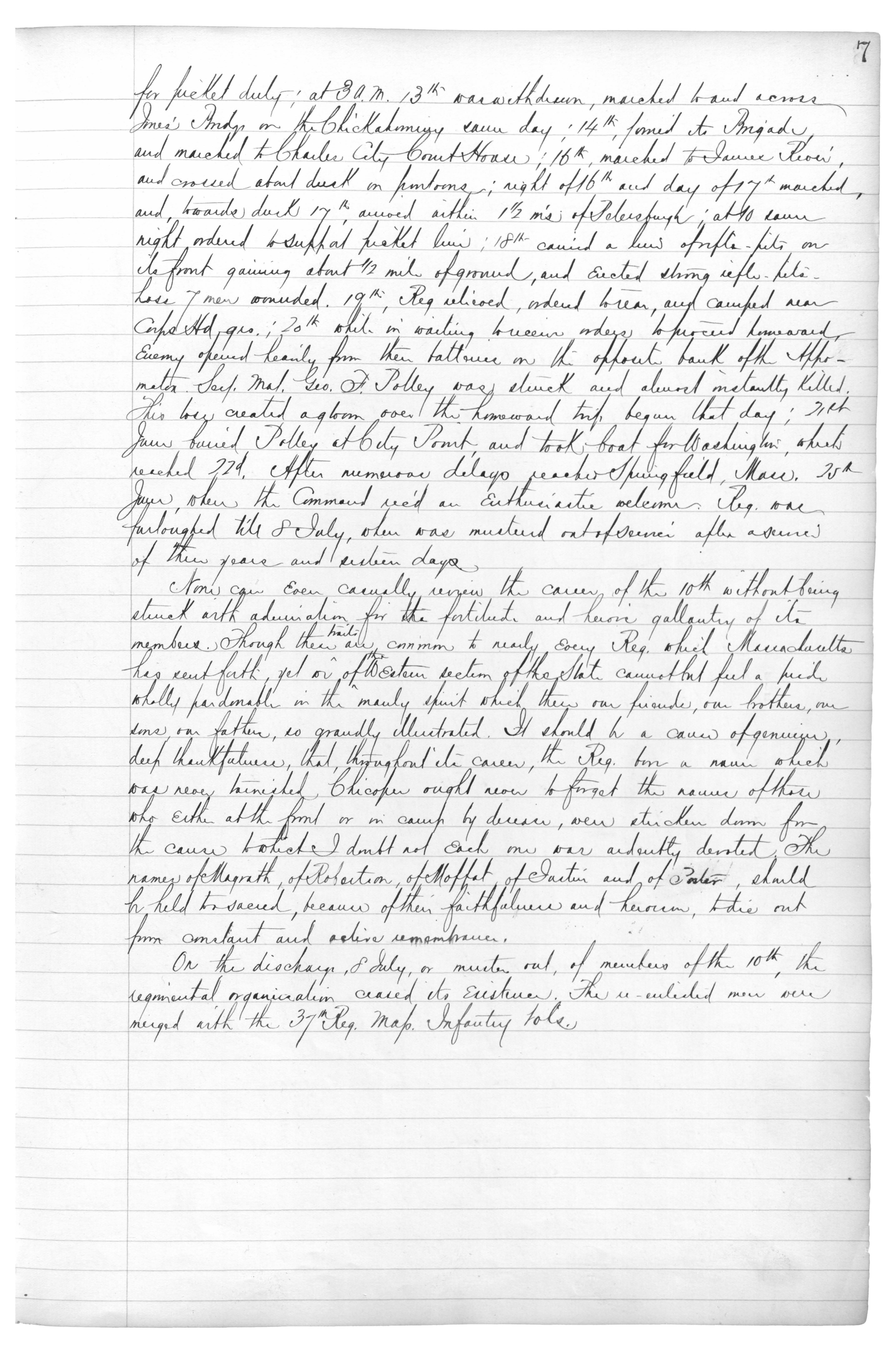 for picket duty; at 3 A.M. 13th was withdrawn, marched to and across Jones' Bridge on the Chickahominy same day; 14th, formed its Brigade and marched to Charles City Court House; 16th, marched to James River, and crossed about disk on pontoons; night of 16th and day of 17th marched, and, towards dusk 17th, arrived within 1 1/2 m's of Petersburgh; at {unreadable} night ordered to support picket line; 18th carried a {unreadable} of rifle-hits on its front gaining about 1/2 mile of ground, and erected strong rifle-hits, loss of 7 men wounded. 19th, Reg relieved, ordered to rrear, and camped near Corps Hd qrs.; 20th while in waiting to receive orders to proceed homeward, enemy opened heavily from their batteries on the opposite bank of the Appomatox. Serg. Maj. Geo. F. Polley was struck and almost instantly killed. This loss created a gloom over the homeward trip begun that day; 21st June buried Polley at City Point, and took boat for Washington, which reached 22d. After numerous delays reached Springfield, Mass. 25th June, where the Command rec'd an enthusiastic welcome. Reg. was furloughed till 8 July, when was mustered out of service after a service of three years and sixtreen days.