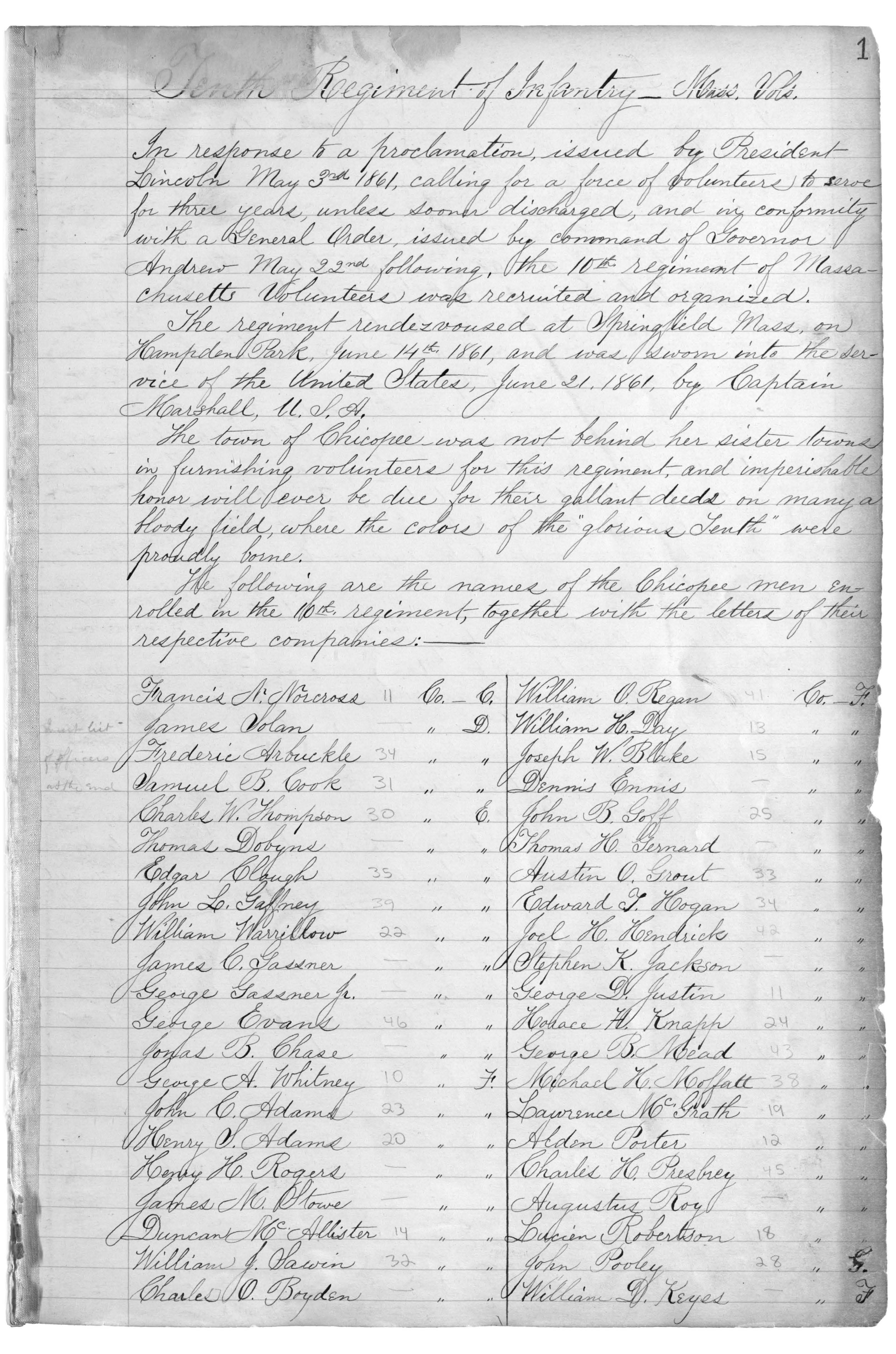 In response to a proclamation, issued by President Lincoln May 3rd 1861, calling for a force of volunteers to serve for three years, unless sooner discharged, and in conformity with a General Order, issued by command of Governor Andrew May 22nd following, the 10th regiment of Massachusetts Volunteers was recruited and organized.