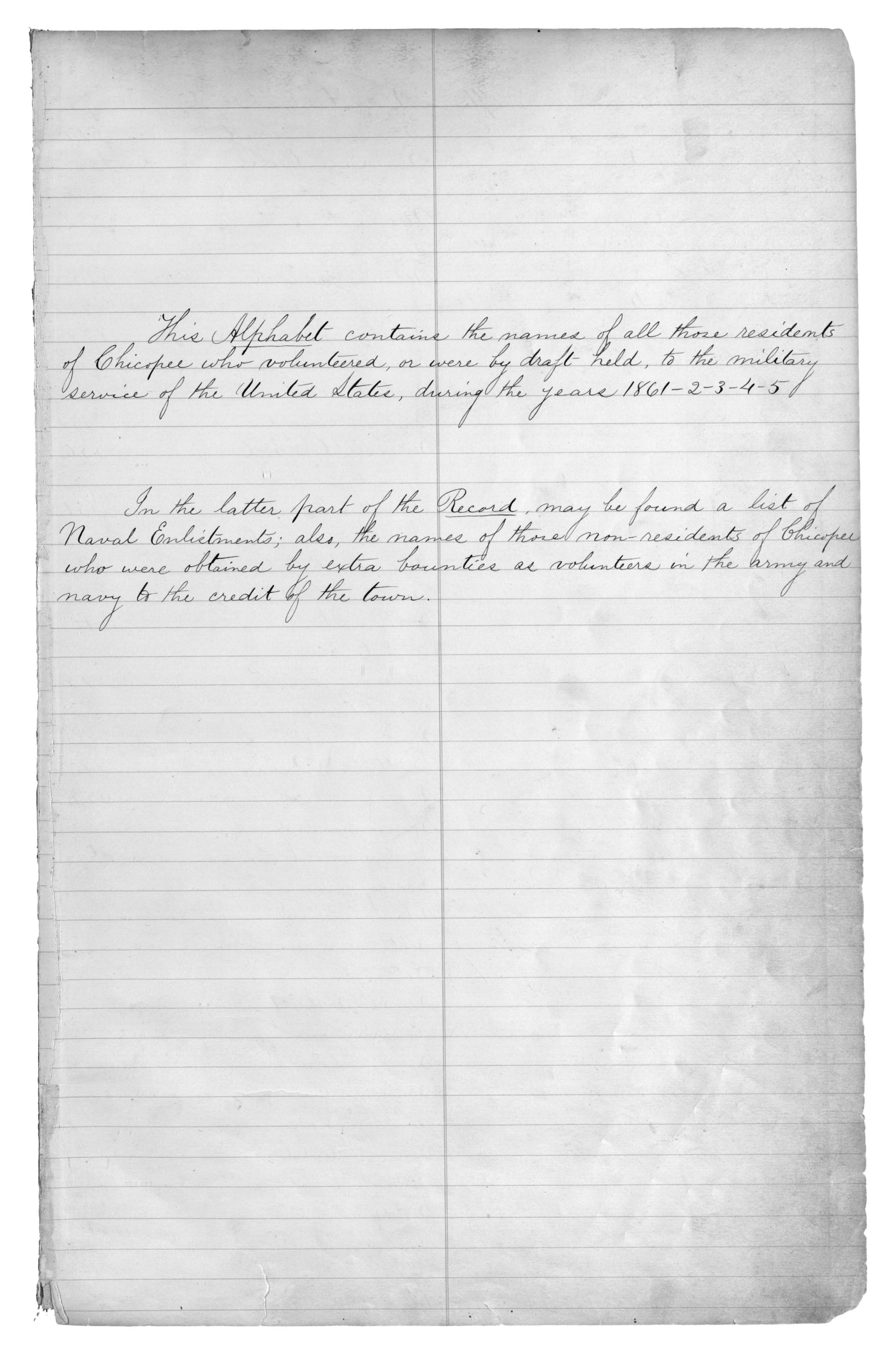 This Alphabet contains the names of all those residents of Chicopee who volunteered, or were by draft held, to the military service of the United States, during the years 1861-2-3-4-5