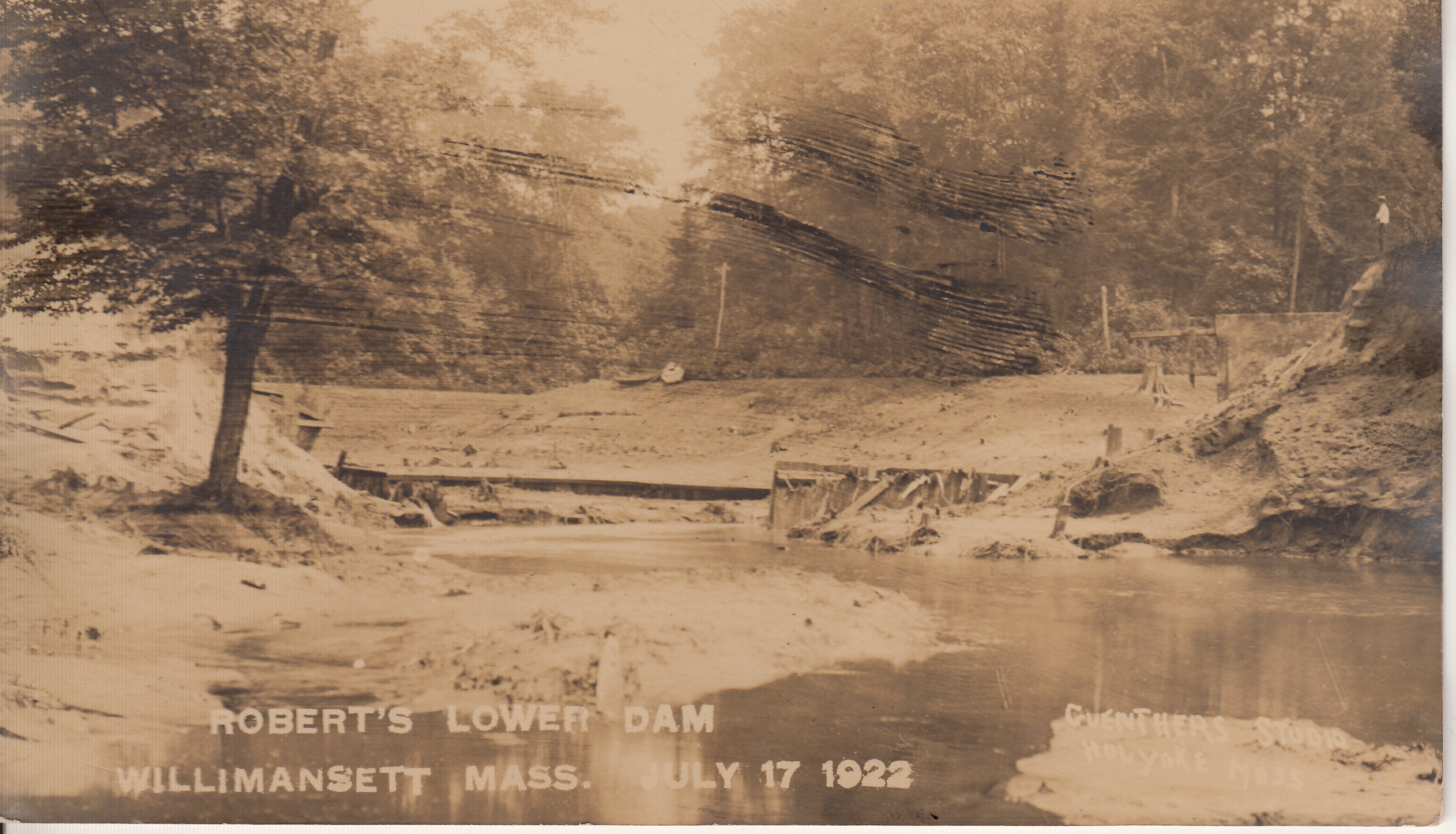 Robert's Pond and lower dam after the upper dam on Langwald's Pond burst on the morning of July 17, 1922. The wooden dam on Roberts Pond was built in 1900 and was used to harvest ice for A.H. Langwald's Icehouse. Photograph developed by Guenther's Studio of Holyoke, MA