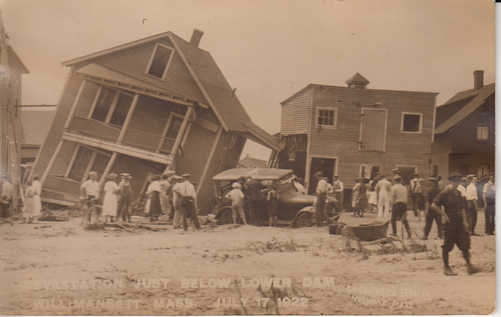 People surveying the devastation of a house and car caused by the flood of 1922 just below the lower dam in Willimansett . Photograph developed by Guenther's Studio of Holyoke, Mass.