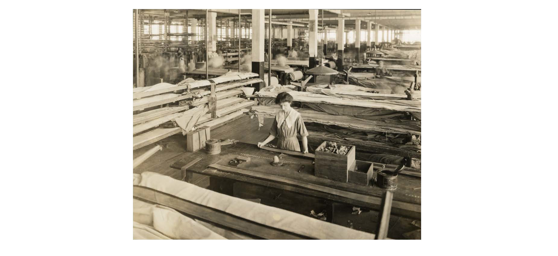 A worker carefully looks at tire cord stretched out on the table. This cotton fabric constituted twenty five percent of every cord tire built by the Fisk Tire Company. The durability of a Fisk tire depended on the careful handling of the fabric by their workers.