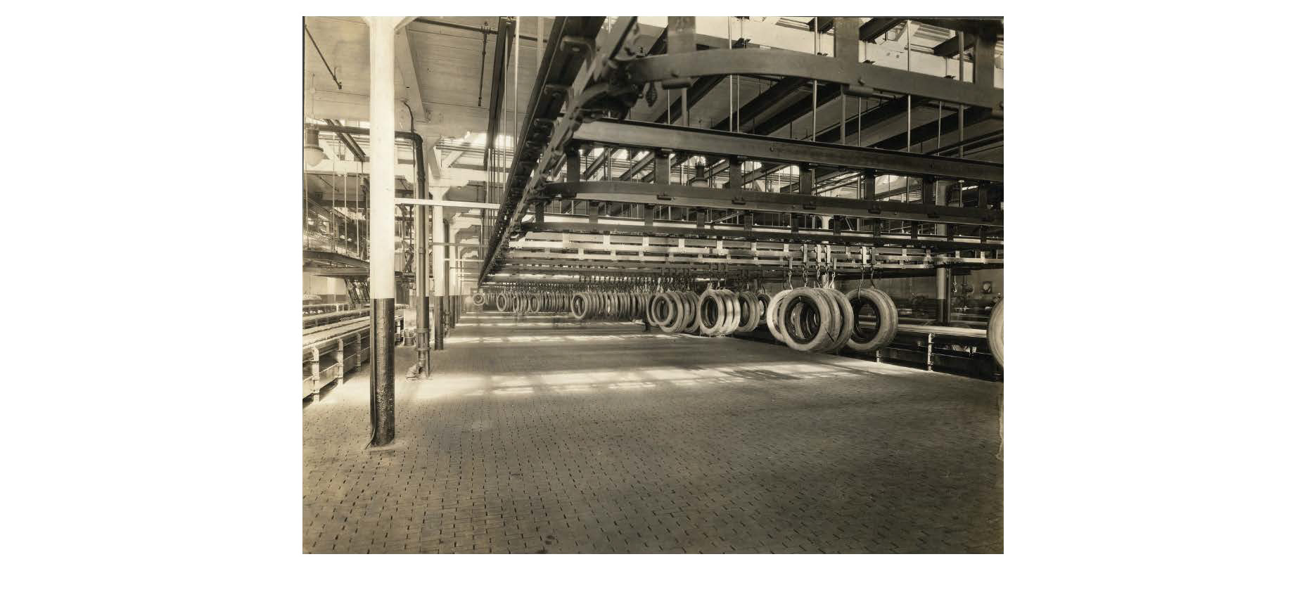 Cord tires awaiting vulcanization are dangling from metal hooks attached to pulleys. These pulleys ran on an overhead circular track. Because of this round shape, workers at the Fisk Tire Company referred to this section of the vulcanizing room as the "merry-go-round".