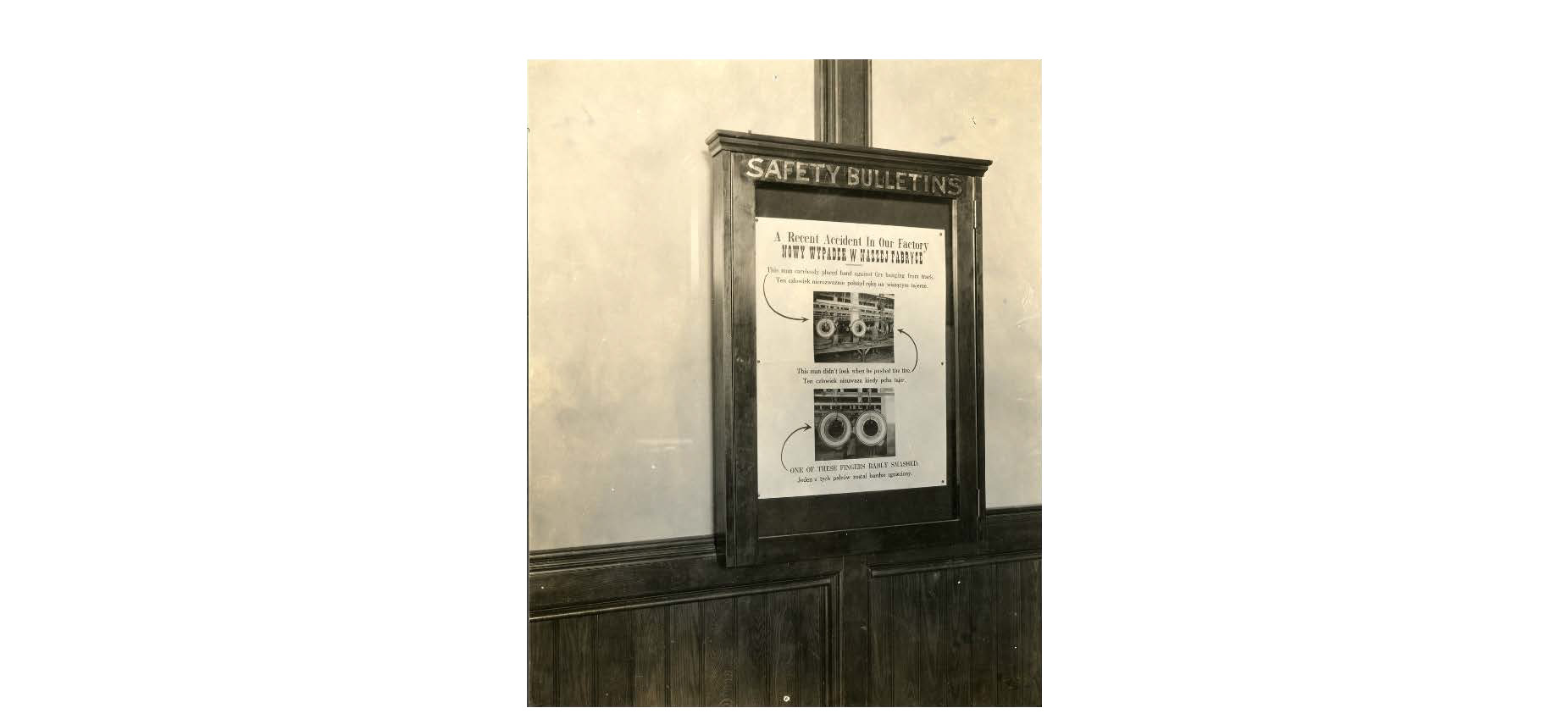 Inside the safety bulletin case, management of the plant has placed a poster which shows and describes how a worker injured his finger while placing his hand on a tire hanging from the overhead track; the worker next to him pushed a tire which smashed one of his fingers. The poster in the case is written both in English and Polish. By 1920, persons born in Poland made up about 9% of the population of Chicopee and many were employed by the Fisk Tire Company.