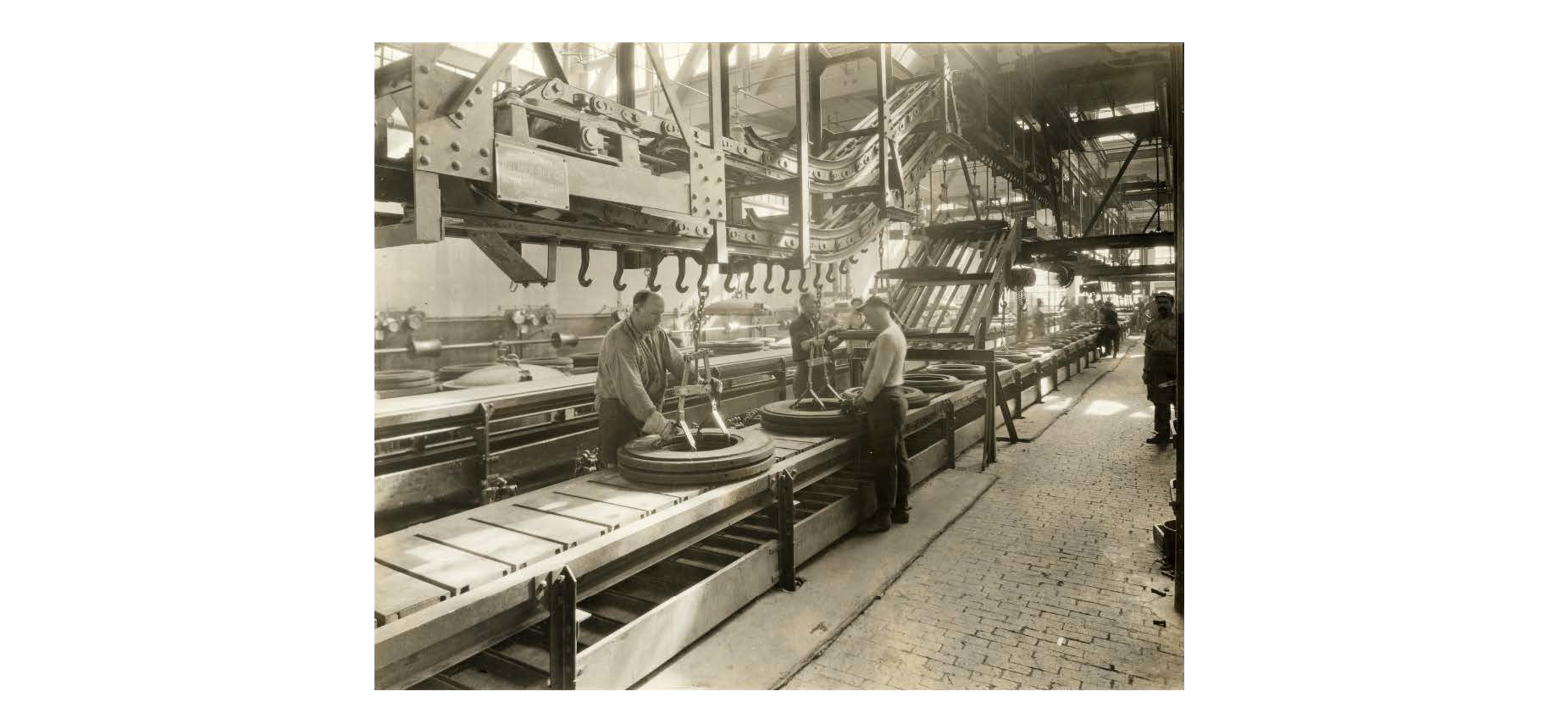 Two workers standing on opposite sides of the conveyer remove the harness which was used to lower the upper mold onto a tire encased by a bottom mold. Removal of the harness was the final procedure before a tire was placed for curing into the vulcanizer where it came out in the desired shape.