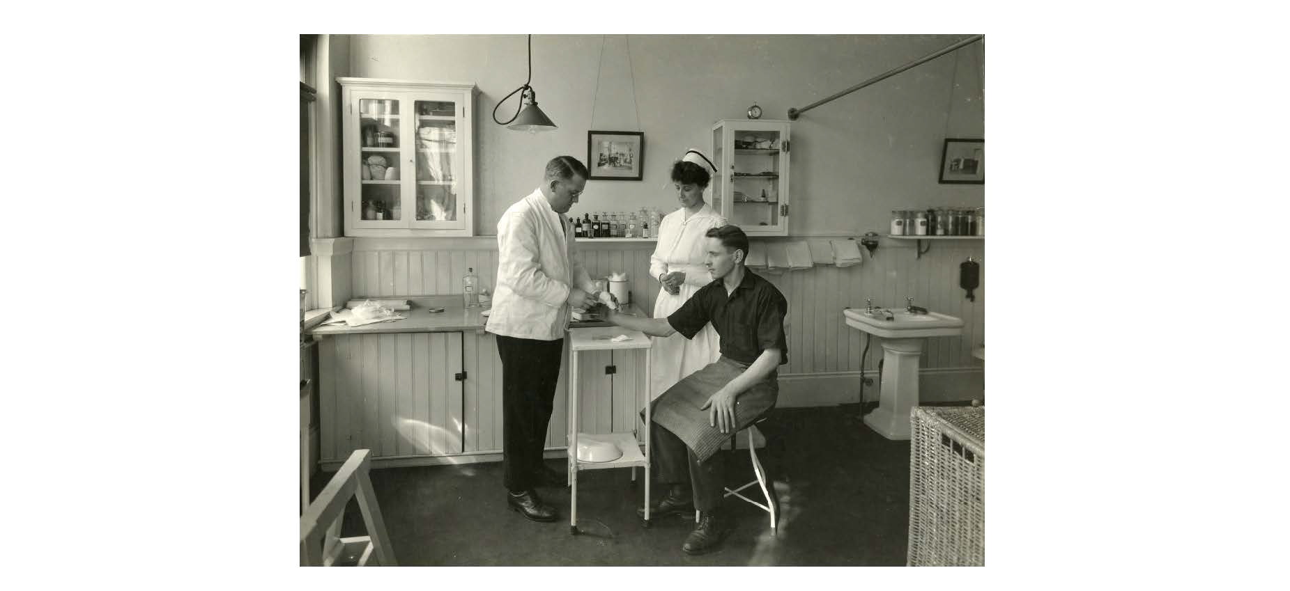 The company doctor is treating a hand injury of an employee while the nurse assists him. The management of the Fisk Tire Company were proud that their company had an emergency hospital staffed by a full-time doctor and nurse.