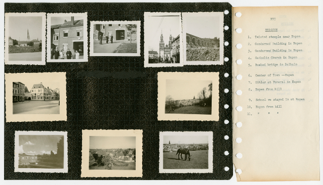 Roy Belliveau joined the United States Army on February 7, 1941 and was assigned to the 57th Signal Battalion, 121st Radio Intelligence Company. He spent the next five years training and getting ready to join the war in Europe. In 1942 he trained in Iceland, then was sent to England in 1943 where he spent over a year training. In October, 1944 he arrived in France and from there took part in campaigns in Belgium, Holland and Germany before coming home to Chicopee, Massachusetts. The scrapbook and photographs in this collection were taken by Belliveau during his time in the army while serving abroad and in Europe during World War II.