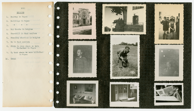 Roy Belliveau joined the United States Army on February 7, 1941 and was assigned to the 57th Signal Battalion, 121st Radio Intelligence Company. He spent the next five years training and getting ready to join the war in Europe. In 1942 he trained in Iceland, then was sent to England in 1943 where he spent over a year training. In October, 1944 he arrived in France and from there took part in campaigns in Belgium, Holland and Germany before coming home to Chicopee, Massachusetts. The scrapbook and photographs in this collection were taken by Belliveau during his time in the army while serving abroad and in Europe during World War II.