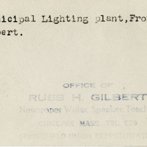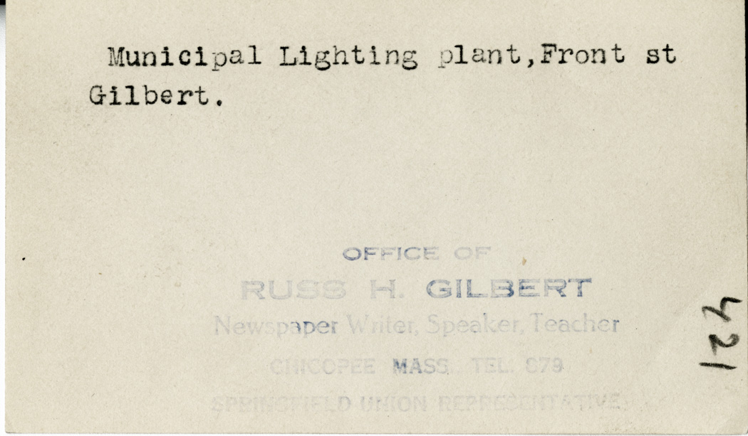 Gilbert, Russ H., “Municipal Lighting Plant, Front Street,” Chicopee Archives Online, accessed March 5, 2026, https://www.chicopeepubliclibrary.org/archives/items/show/4558.