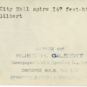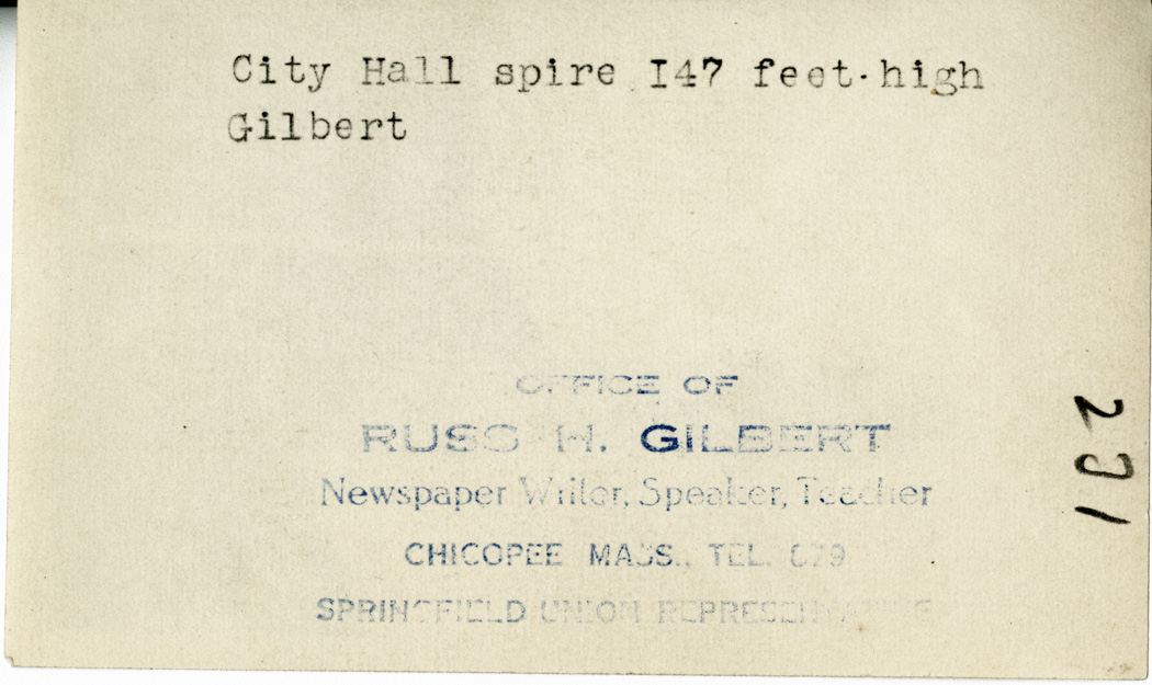 Gilbert, Russ H., “City Hall Spire,” Chicopee Archives Online, accessed March 5, 2026, https://www.chicopeepubliclibrary.org/archives/items/show/4559.