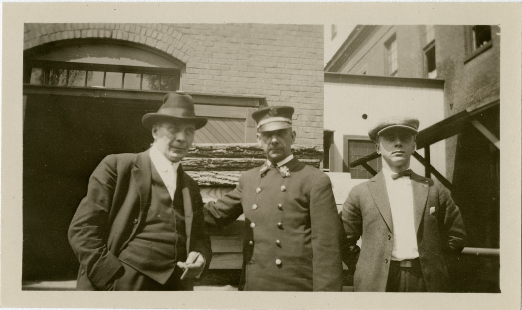 Indentities unkown, but caption states (Fire) Chief of Palmer and Chief of Ware at the test of the new triple-com pumper test.