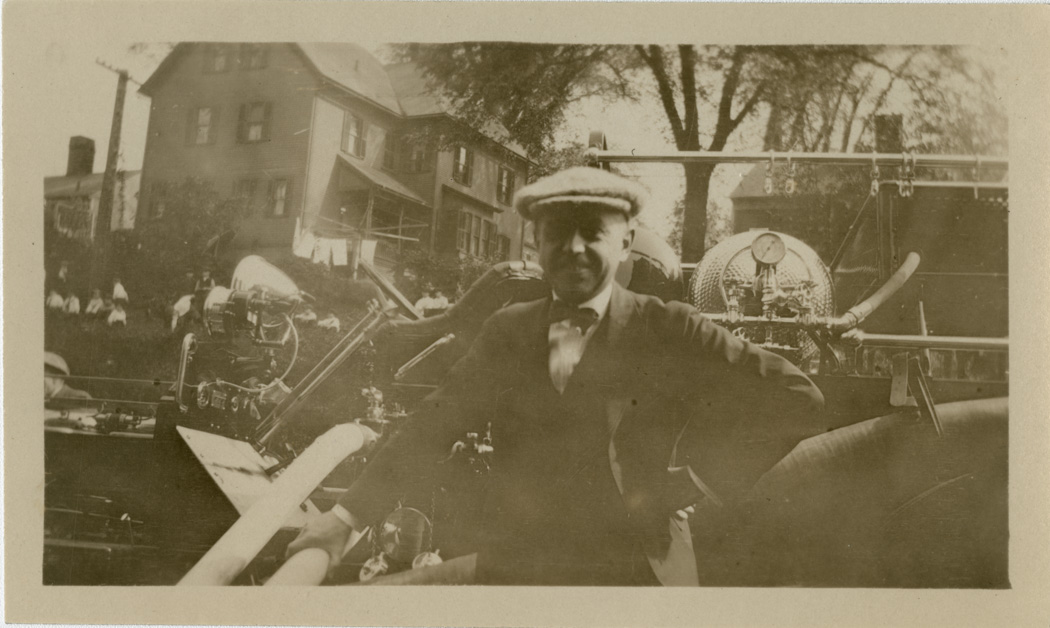 Portrait of A. Couture of A. G. Spalding Company with fire truck.
