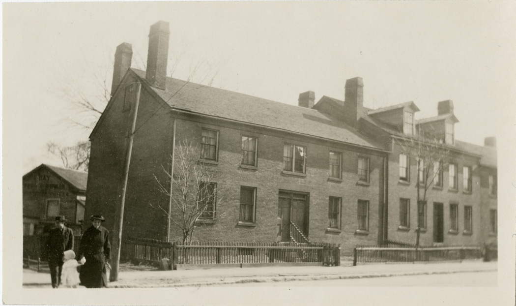 Front view of Walsh Block, Sprngfield Street with a woman walking and holding a child's hand and a man walking on the left bottom of the photograph.