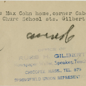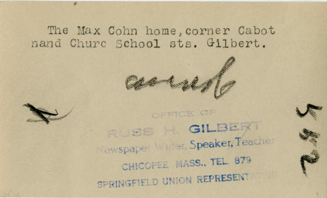 Gilbert, Russ H., “The Max Cohn Home,” Chicopee Archives Online, accessed March 6, 2026, https://www.chicopeepubliclibrary.org/archives/items/show/4599.