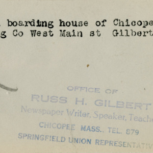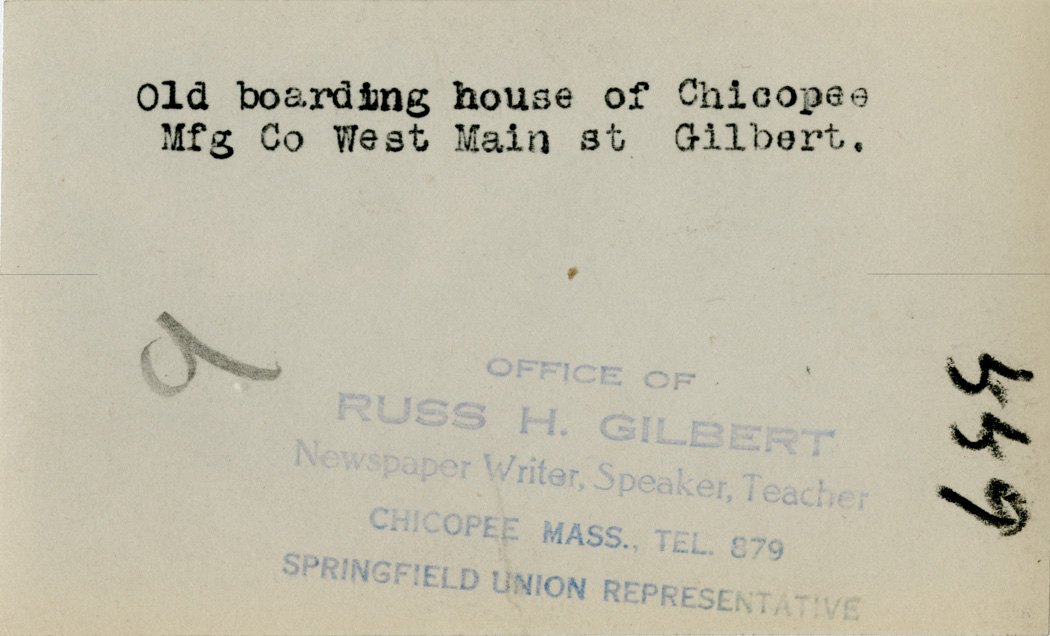 Gilbert, Russ H., “West Main Street Boarding House,” Chicopee Archives Online, accessed March 6, 2026, https://www.chicopeepubliclibrary.org/archives/items/show/4602.