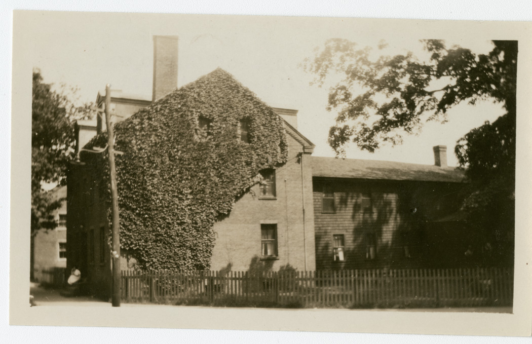 View of the West Main Street Boarding House showing the vine covered side of the building and the fenced in entrance. It was the former boarding house for the Chicopee Manufacturing Company.
