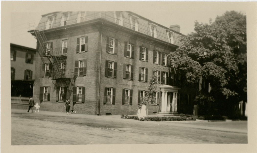 Front and side of the Dwight Manufacturing Company Tenement building on the corner of Perkins and Exchange Streets, with a large tree on the right and people walking along the sidewalk.