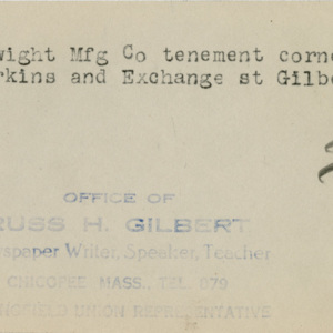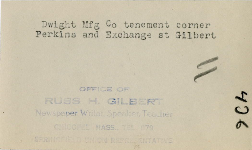 Gilbert, Russ H., “Dwight Manufacturing Company Tenement,” Chicopee Archives Online, accessed March 6, 2026, https://www.chicopeepubliclibrary.org/archives/items/show/4606.