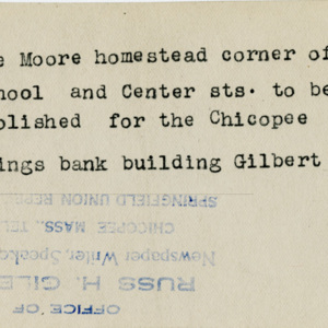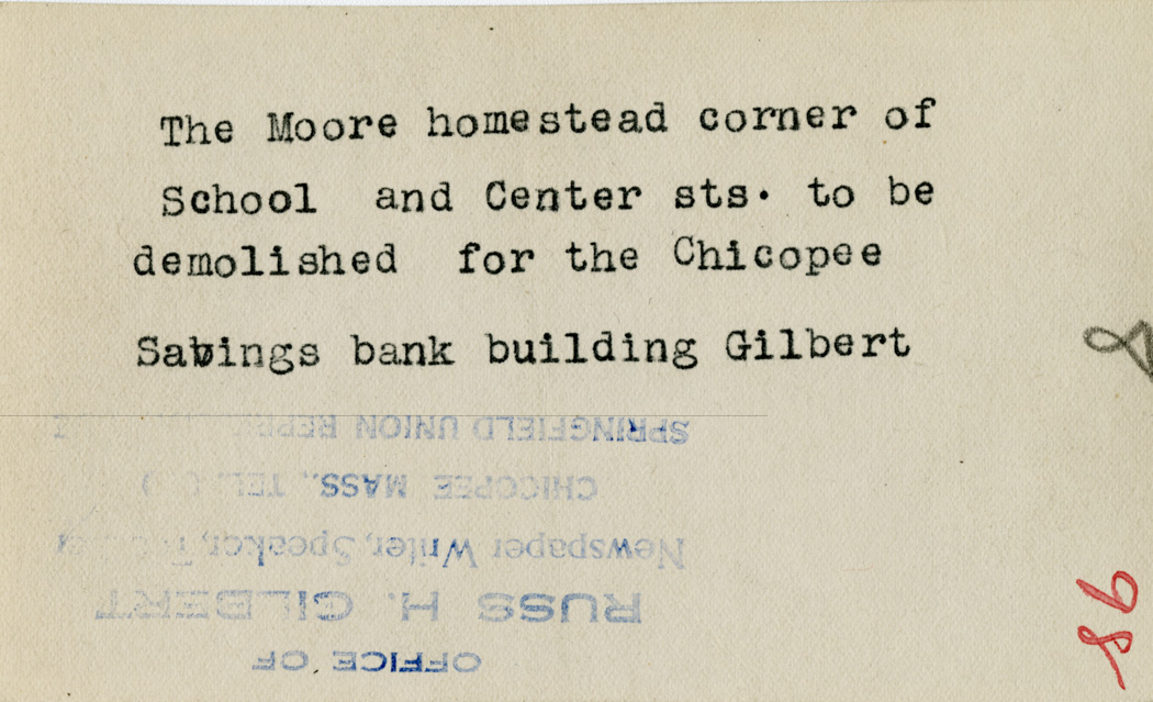 Gilbert, Russ H., “The Moore Homestead,” Chicopee Archives Online, accessed March 6, 2026, https://www.chicopeepubliclibrary.org/archives/items/show/4607.