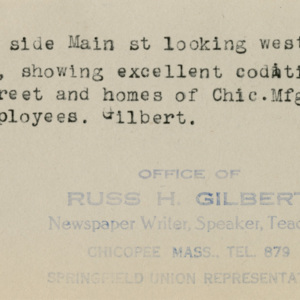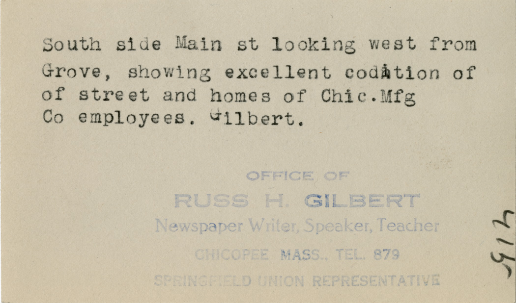 View of the South side of Main Street from Grove Street showing the street and homes of the Chicopee Manufacturing Company employees.