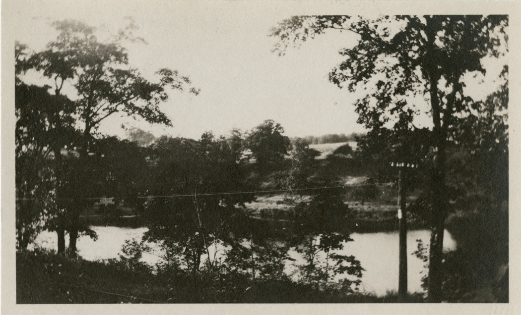 View of the Chicopee River from the back of the lighting plant showing both sides of the river and trees and a field in the distance