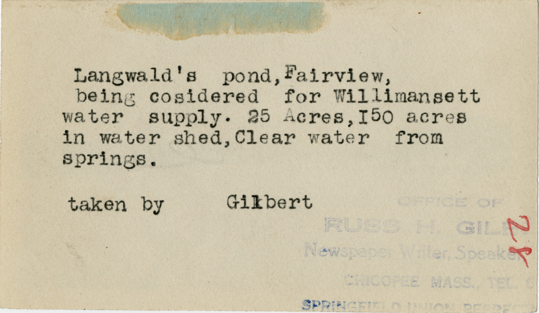 Gilbert, Russ H., “Langwald's Pond, Fairview,” Chicopee Archives Online, accessed March 6, 2026, https://www.chicopeepubliclibrary.org/archives/items/show/4664.