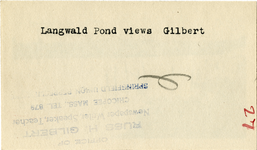 Gilbert, Russ H., “Langwald's Pond, Fairview,” Chicopee Archives Online, accessed March 5, 2026, https://www.chicopeepubliclibrary.org/archives/items/show/4667.