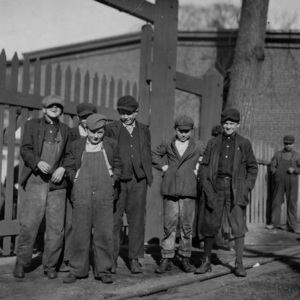 Group of workers in Dwight Mfg. Co. Stanley Twarog (one of the smallest boys), 81 Park St. Works in spinning room. Tony Sccha [i.e., Soccha], (Shortest boy in front, overalls. Very young. 65 Exchange St. A bobbin Boy in Room 7; has been there a year.