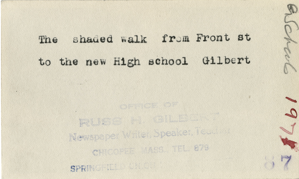Gilbert, Russ H., “The Shaded Walk,” Chicopee Archives Online, accessed March 6, 2026, https://www.chicopeepubliclibrary.org/archives/items/show/4682.