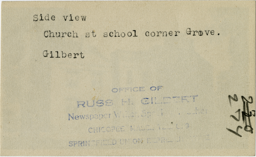 Gilbert, Russ H., “Side view Church Street School,” Chicopee Archives Online, accessed March 6, 2026, https://www.chicopeepubliclibrary.org/archives/items/show/4707.