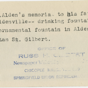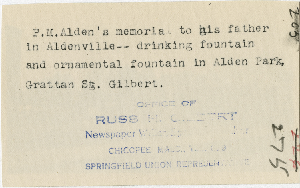 Gilbert, Russ H., “Alden Memorial,” Chicopee Archives Online, accessed March 6, 2026, https://www.chicopeepubliclibrary.org/archives/items/show/4721.