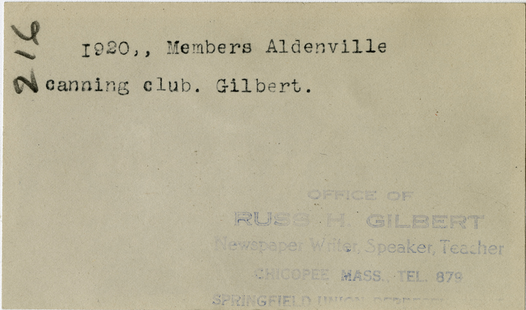 Gilbert, Russ H., “Aldenville Canning Club Member,” Chicopee Archives Online, accessed March 6, 2026, https://www.chicopeepubliclibrary.org/archives/items/show/4742.