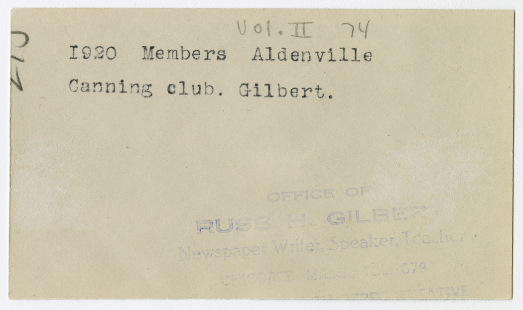 Gilbert, Russ H., “Aldenville Canning Club Members,” Chicopee Archives Online, accessed March 6, 2026, https://www.chicopeepubliclibrary.org/archives/items/show/4752.