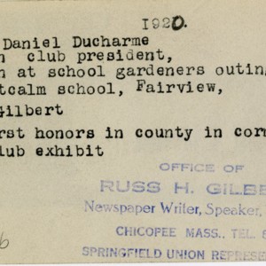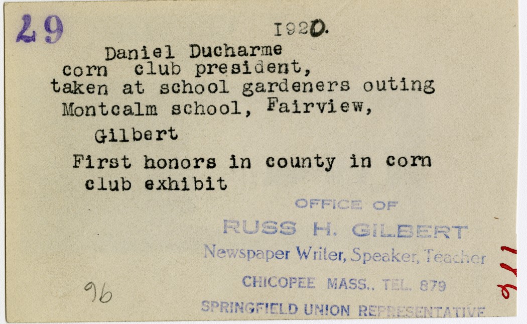 Gilbert, Russ H., “Daniel Ducharme, Corn Club President,” Chicopee Archives Online, accessed March 6, 2026, https://www.chicopeepubliclibrary.org/archives/items/show/4774.