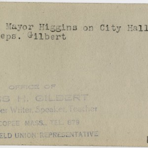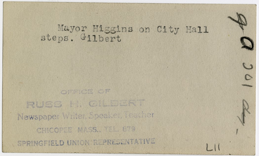 Gilbert, Russ H., “Mayor Higgins,” Chicopee Archives Online, accessed March 6, 2026, https://www.chicopeepubliclibrary.org/archives/items/show/4795.