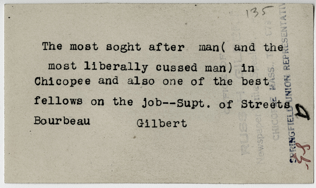 Gilbert, Russ H., “The most sought after man,” Chicopee Archives Online, accessed March 6, 2026, https://www.chicopeepubliclibrary.org/archives/items/show/4813.