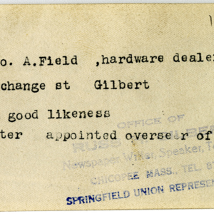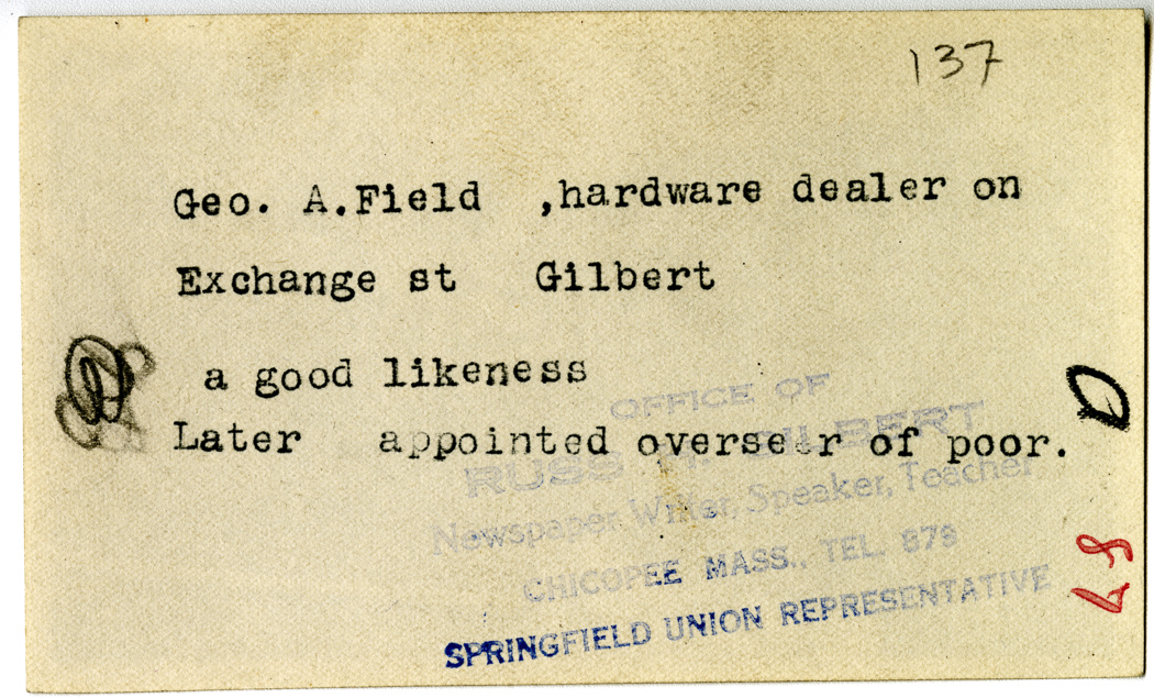Gilbert, Russ H., “Geo. A. Field,” Chicopee Archives Online, accessed March 6, 2026, https://www.chicopeepubliclibrary.org/archives/items/show/4815.