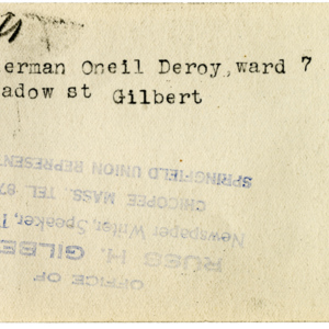 Gilbert, Russ H., “Alderman Oneill Deroy, Ward 7,” Chicopee Archives Online, accessed March 6, 2026, https://www.chicopeepubliclibrary.org/archives/items/show/4816.