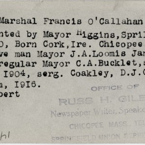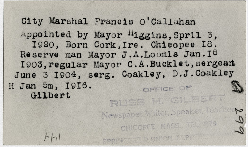 Gilbert, Russ H., “City Marchall Francis O'Callahan,” Chicopee Archives Online, accessed March 6, 2026, https://www.chicopeepubliclibrary.org/archives/items/show/4822.