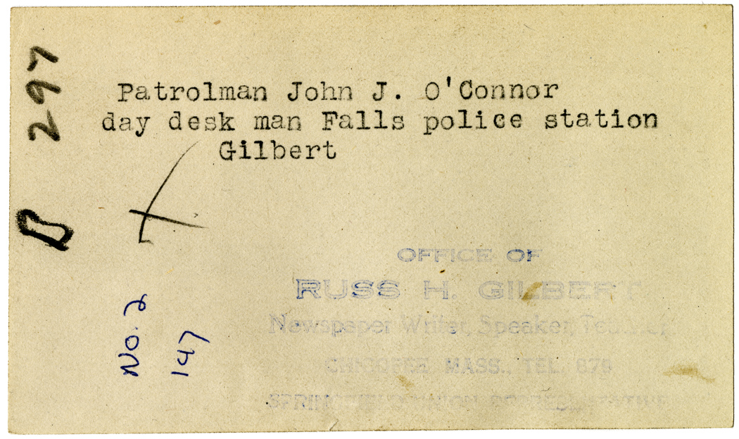 Gilbert, Russ H., “Patrolman John J. O'Connor,” Chicopee Archives Online, accessed March 6, 2026, https://www.chicopeepubliclibrary.org/archives/items/show/4825.