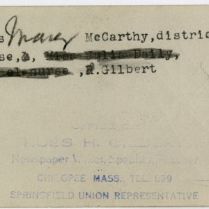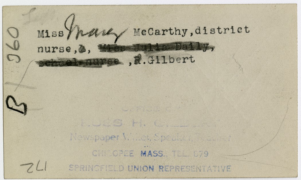 Gilbert, Russ H., “District Nurse Mary McCarthy,” Chicopee Archives Online, accessed March 6, 2026, https://www.chicopeepubliclibrary.org/archives/items/show/4850.