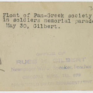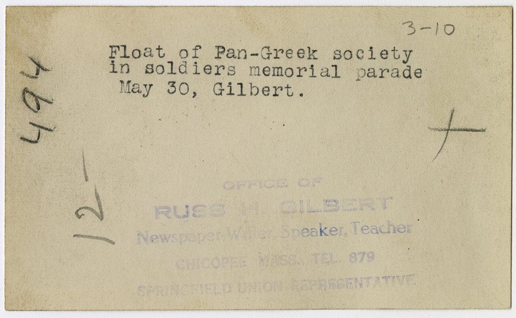 Gilbert, Russ H., “Pan-Greek Society Float,” Chicopee Archives Online, accessed March 6, 2026, https://www.chicopeepubliclibrary.org/archives/items/show/4906.