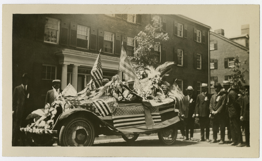 Pan-Greek Society Float, decorated with flags and banners, in the Memorial Day Parade May 30, 1921
