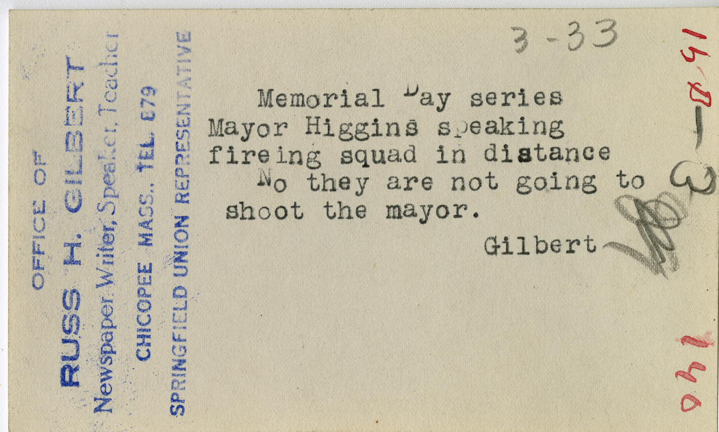 Gilbert, Russ H., “Mayor at Memorial Day,” Chicopee Archives Online, accessed March 6, 2026, https://www.chicopeepubliclibrary.org/archives/items/show/4929.