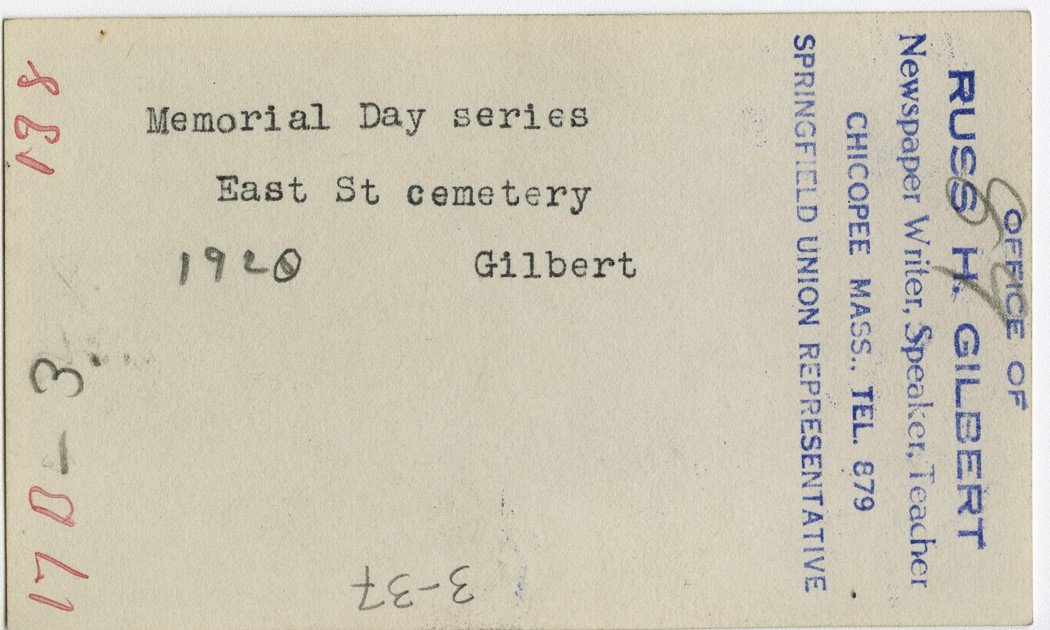 Gilbert, Russ H., “Memorial Day at East Street Cemetery,” Chicopee Archives Online, accessed March 6, 2026, https://www.chicopeepubliclibrary.org/archives/items/show/4933.