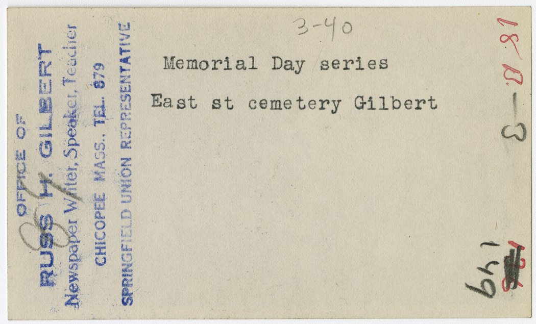 Gilbert, Russ H., “Memorial Day at East Street Cemetery,” Chicopee Archives Online, accessed March 6, 2026, https://www.chicopeepubliclibrary.org/archives/items/show/4936.