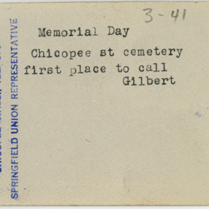Gilbert, Russ H., “Memorial Day First Stop,” Chicopee Archives Online, accessed March 6, 2026, https://www.chicopeepubliclibrary.org/archives/items/show/4937.